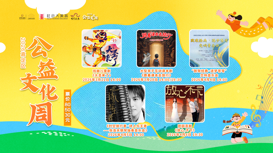 由嘉定区文化和旅游局主办、上海保利大剧院承办的2026嘉定区“公益文化周”,3月21日-4月6日将带来5台6场演出,涵盖戏曲儿童剧《大圣来了》、大型亲子互动课本剧《跟着课本去旅行》、“致敬经典·逐梦苍穹”交响音乐会、张浩天钢琴独奏音乐会和团圆喜剧《放心,不下》。