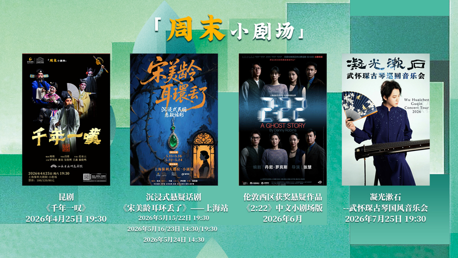 在周末小剧场则有苏州昆剧院《千年一叹》、沉浸式悬疑话剧《宋美龄的耳环丢了》,上海话剧艺术中心出品制作悬疑剧《2:22》、武怀琛古琴国风音乐会等。