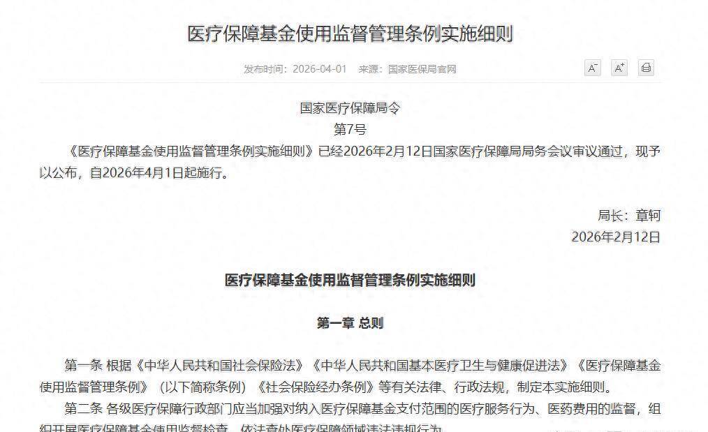 导语: 2026年4月1日,备受医疗大健康行业瞩目的《医疗保障基金使用监督管理条例实施细则》(国家医疗保障局令 第7号)正式施行。