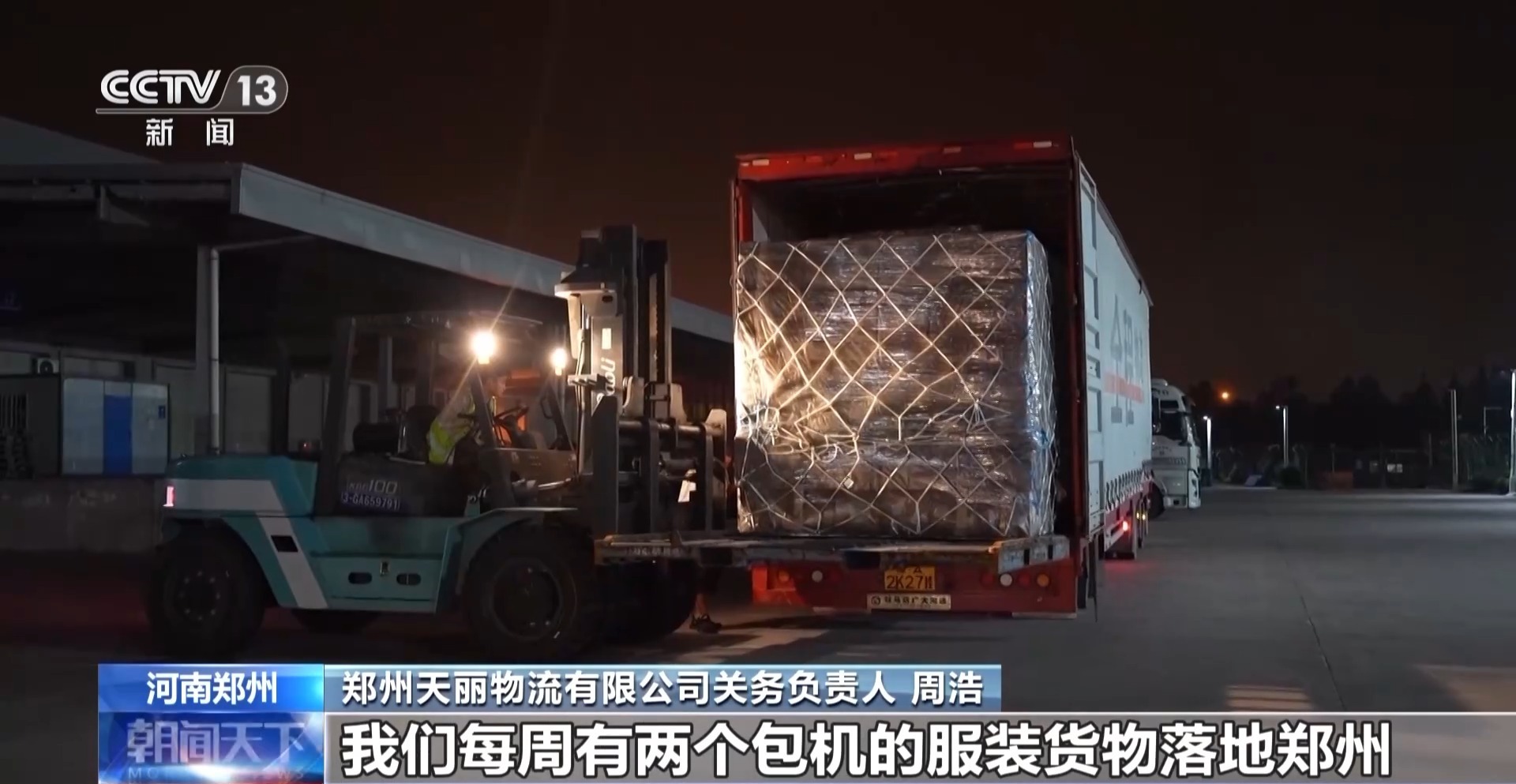 郑州天丽物流有限公司关务负责人 周浩:由于通关时效的整体提升,我们每周有两个包机的服装货物落地郑州。郑州落地货物的全国占比由原来的20%到30%,提升到了现在的60%。