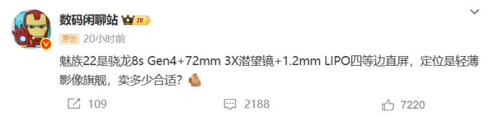 魅族22会在9月中上旬发布,算算时间也没多久了,这一次应该不会拖延,据博主数码闲聊站爆料,处理器采用骁龙8s Gen 4,跑分有两百万出头,日常使用没啥问题,如果定价在两千多元就很香。