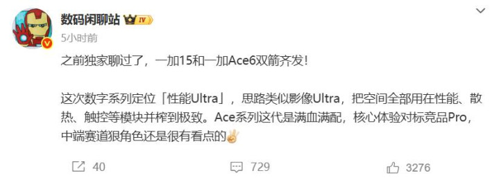 一加ace系列新款有满血满配,核心体验对标竞品pro,一加ace 6也会跟一加15一起上市,再有一个月多就能看到了,搭载骁龙8至尊版处理器,配备LPDDR5X+UFS4.1。