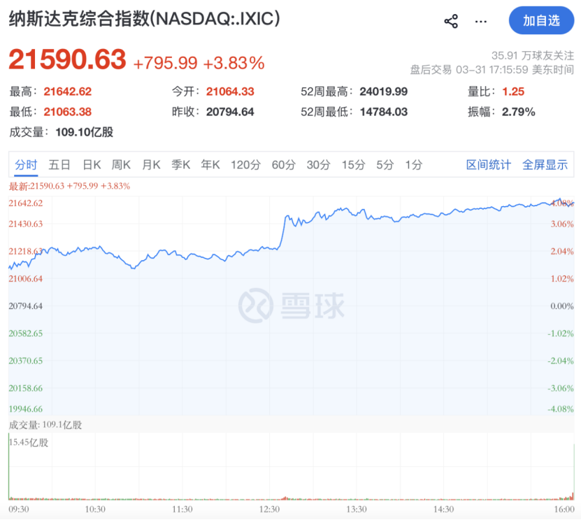 美东时间3月31日,美股三大指数大幅飙升,截至收盘,道指大涨2.49%,纳指暴涨3.83%,标普500指数大涨2.91%,均创下去年5月以来最大单日涨幅。
